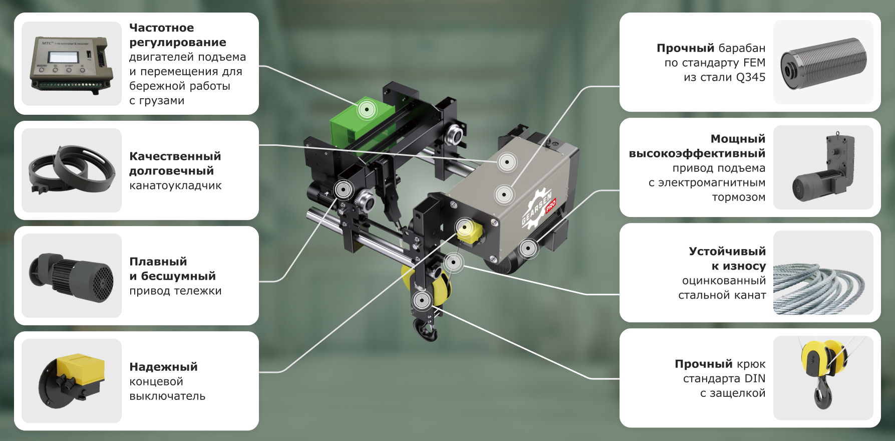 Безопасность при эксплуатации ГПО является приоритетом, особенно в условиях высокой интенсивности, когда внимание оператора может притупляться. Тали серии PRO SH оснащаются электронным ограничителем грузоподъемности. Эта система мгновенно считывает ток или нагрузку на валу и блокирует подъем при превышении номинального веса, предотвращая обрыв каната или деформацию балки.