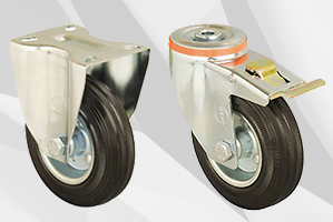Неповоротные и поворотные колёса для платформенных тележек обычно продаются вместе с металлическими кронштейнами. Такие комплекты называются колёсными опорами.