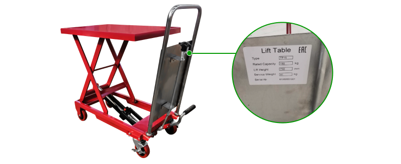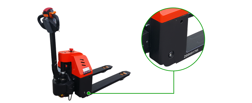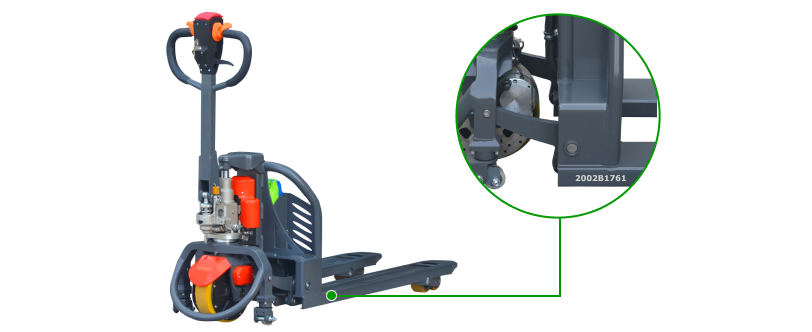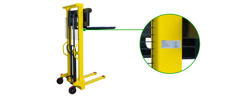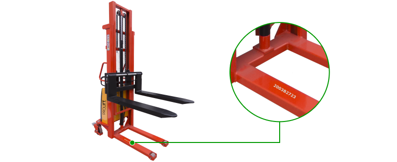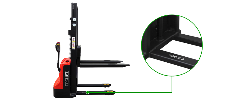 под вилами на верхней поверхности правой опорной консоли штабелера или на наклейке