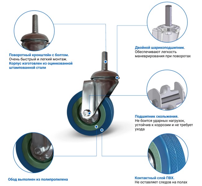 Аппаратная колесная опора с ободом из полипропилена и болтовым креплением. Шинка из поливинилхлорида (ПВХ) не оставляет следов на полу, легко катится по поверхности. Подшипник скольжения в ступице защищен металлическими дисками. Диаметр колеса 75 мм, высота колесной опоры 100 мм, диаметр крепёжного болта 10 мм. Болт имеет стандартный шаг резьбы, что позволяет как вкручивать опору сразу в изделия, так и зажимать с помощью гайки. Ширина обода 23 мм. Допустимая грузоподъёмность 45 кг. Подходит для установки в покупательские тележки, медицинскую технику и мебель.300+ человек
