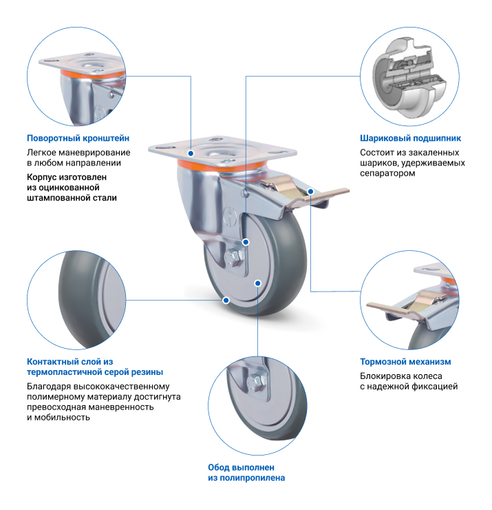 Аппаратное поворотное колесо с кронштейном из оцинкованной стали и тормозом. Обод из полипропилена закрывают пластиковые кожухи, контактный слой из серой литой резины. Диаметр 125 мм, высота колесной опоры 157 мм. Платформа имеет размеры 85x100 мм и 4 отверстия под болты. Максимальная грузоподъёмность до 90 кг. Используется в помещениях с высокими санитарно-гигиеническими нормами. Подходит для медицинской мебели и оборудования, покупательских тележек. Ножной тормоз надёжно фиксирует колесо на время стоянки.