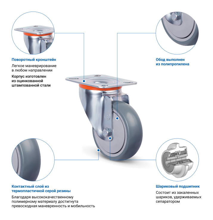 Поворотное аппаратное колесо с кронштейном из оцинкованной стали. Обод из полипропилена закрывают пластиковые кожухи, контактный слой из термопластичной серой резины. Диаметр 125 мм, высота колесной опоры 157 мм. Платформа с 4 отверстиями для крепления имеет размеры 85x100 мм. Допустимая грузоподъёмность до 90 кг. Для медицинской мебели и оборудования, покупательских тележек. Используется в учреждениях с высокими санитарно-гигиеническими требованиями.