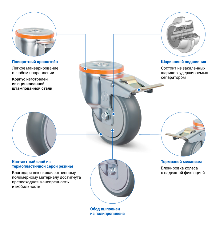 Поворотное аппаратное колесо с кронштейном из оцинкованной стали и тормозным механизмом. Обод отлит из прочного полипропилена, шинка из серой литой резины. Ступица и подшипник закрыт пластиковыми дисками. Диаметр колеса 80 мм, высота колесной опоры 106 мм. размер отверстия под болт – 12 мм. Максимальная грузоподъёмность до 75 кг. Соответствует санитарно-гигиеническим нормам, хорошо поддаётся влажной обработке. Подходит для медицинской мебели и оборудования, покупательских тележек, аппаратуры.