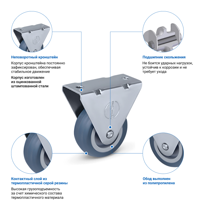 Аппаратная колесная опора с ободом из полипропилена и неповоротным кронштейном из оцинкованной стали. Диаметр 50 мм, высота колесной опоры 69 мм. Размер платформы 66x29 мм, межосевой размер 50x50 мм. Рекомендованная грузоподъёмность 35 кг. Шинка из серой термопластичной резины не пачкает пол. Для покупательских тележек, медицинской мебели и оборудования. Соответствует предъявляемым санитарно-гигиеническим нормам.