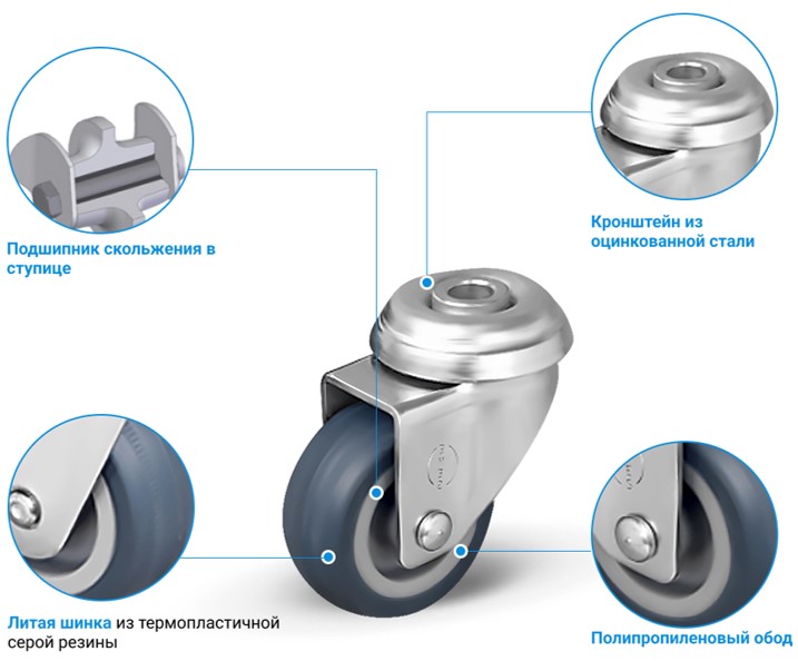 Аппаратное колесо с ободом из полипропилена и шинкой из термопластичной резины диаметром 50 мм. Высота колесной опоры 69 мм. Размер отверстия под болт 10 мм. Грузоподъёмность до 35 кг. Шинка из аппаратной резины не пачкает полы, легко моется. Рекомендуется для покупательских тележек, медицинской мебели и оборудования. Соответствует предъявляемым санитарно-гигиеническим нормам.