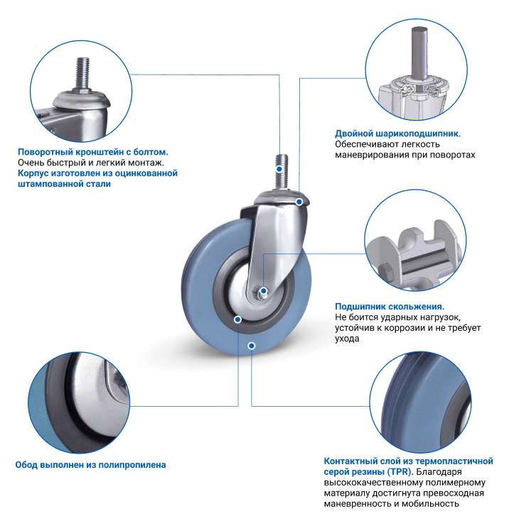 Колесная опора поворотная с ободом из полипропилена и шинкой из серой аппаратной резины. В ступице подшипник скольжения, закрытый защитными дисками. Диаметр колеса 50 мм, высота колёсной опоры 70 мм. Ширина обода 18 мм, диаметр крепёжного болта – 10 мм. Грузоподъёмность до 25 кг. Устанавливается в покупательские тележки, медицинскую технику и мебель. Используются в помещениях с высокими санитарными нормами: лабораториях, гостиницах, торговых залах.