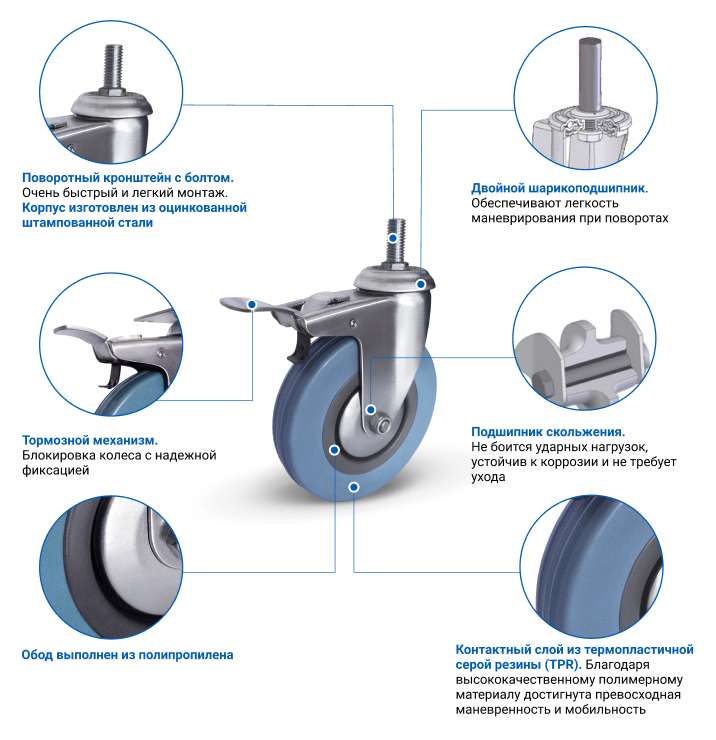 Поворотная колесная опора с оцинкованным стальным кронштейном и контактным слоем из серой резины. В ступице подшипник скольжения, защищённый специальными металлическими колпаками. Диаметр колеса 50 мм, высота с кронштейном 70 мм. Крепёжный болт имеет диаметр 10 мм. Грузоподъёмность до 25 кг. Рекомендуется для покупательских тележек, медицинского оборудования и мебели. Используется в учреждениях с высокими санитарно-гигиеническими нормами: гостиницах, предприятиях общественного питания. Ножной тормоз обеспечивает неподвижность во время стоянки.