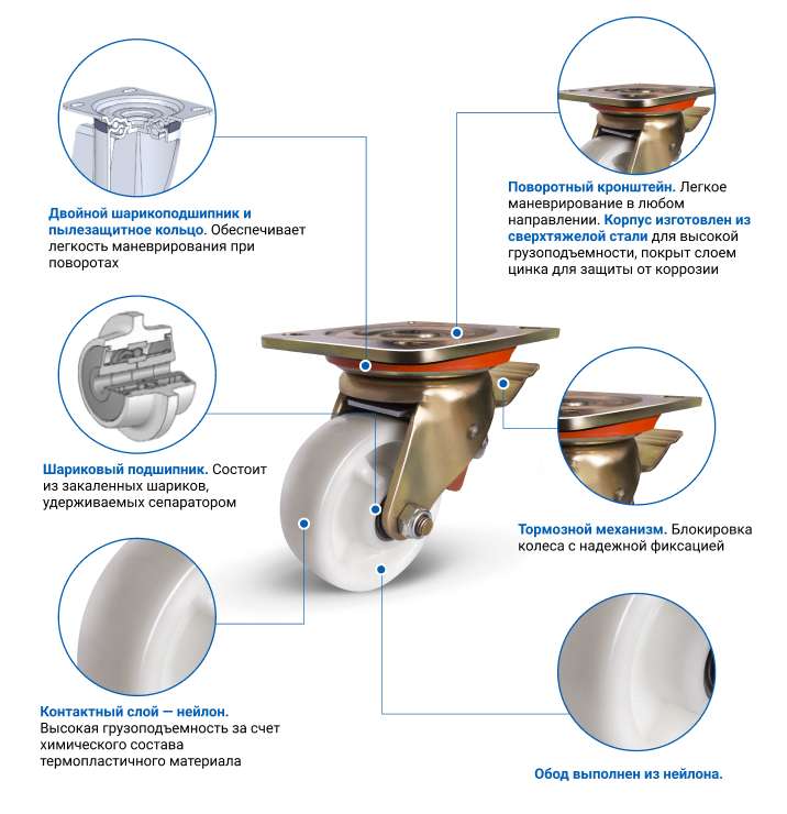 Поворотное колесо из нейлона с тормозом имеет диаметр 150 мм, ширина обода 45 мм. Для крепления предусмотрена платформа размером 115x140 мм с четырьмя отверстиями для болтов. Расстояние между центрами отверстий 81x105 мм. Грузоподъемность 550 кг. Ножной тормоз защитит от самопроизвольного движения во время стоянки. Устанавливается в большегрузное передвижное медицинское оборудование и технику, платформенные тележки для предприятий пищевой промышленности.