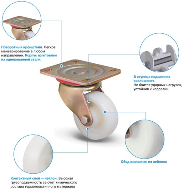Нейлоновое монолитное колесо диаметром 125 мм с подшипником скольжения в ступице. Поворотный кронштейн с платформой размером 115x140 мм изготовлен из закалённой стали. Расстояние между центрами отверстий 81x105 мм, высота колёсной опоры 170 мм. Обод выделен конструктивно и имеет ширину 40 мм. Грузоподъемность 400 кг рассчитана на установку в большегрузные платформенные тележки, технику и мебель для медицинских учреждений, пищевой промышленности.300+ человек
