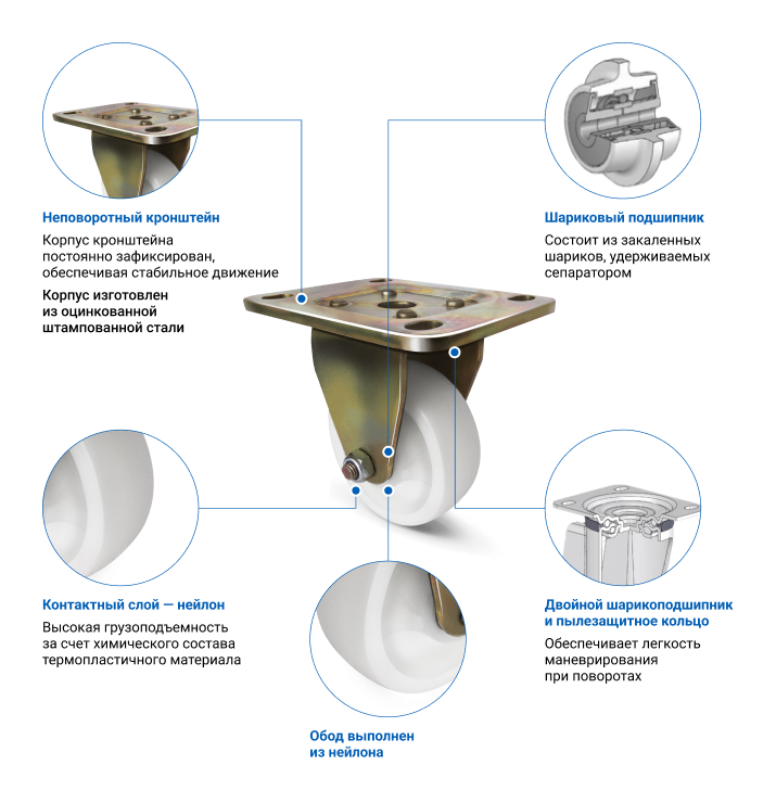 Колесо цельнолитое из нейлона имеет диаметр 150 мм. Для крепления предусмотрен неповоротный сварной кронштейн из стали, покрытый лаком. Платформа для крепления имеет размеры 115x140 мм. Высота колёсной опоры 206 мм, грузоподъемность 550 кг. Устанавливается в большегрузное медицинское оборудование и технику, платформенные тележки. Хорошо поддается санитарной обработке.300+ человек