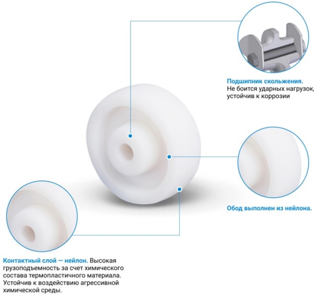 Цельнолитое колесо из нейлона имеет диаметр 55 мм и грузоподъемность 150 кг. Конструктивно выделяются ступица и обод. Диаметр внутренней оси 12 мм. Химически стойкое, хорошо поддаётся влажной обработке, устойчиво к истиранию. Устанавливается в большегрузное оборудование, сервисную технику, тележки для использования в помещениях с высокими санитарно-гигиеническими нормами.