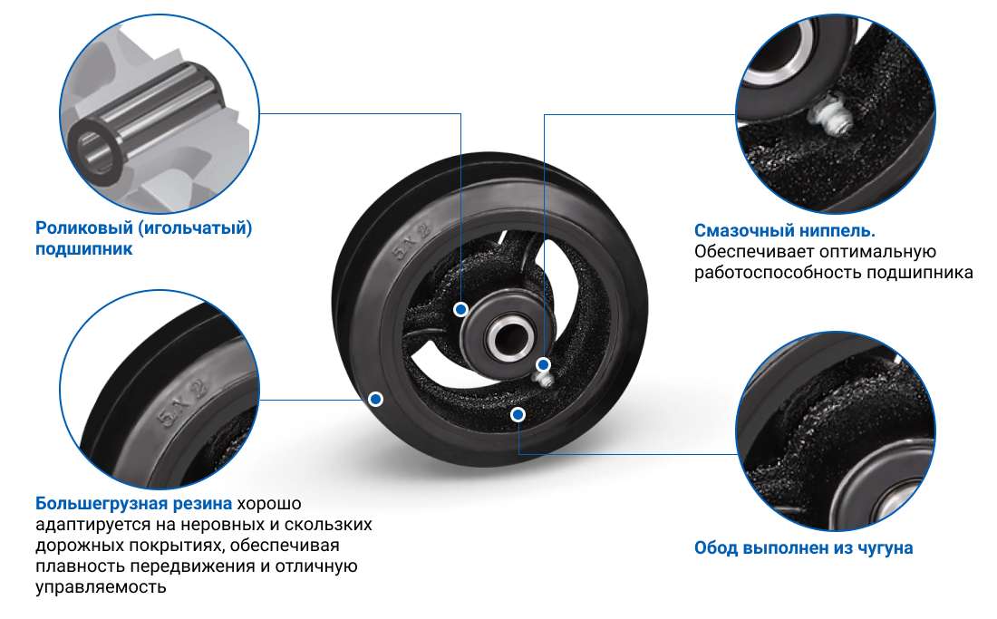Большегрузное колесо с ободом из чугуна и шинкой из литой резины имеет диаметр 125 мм. Ширина обода 50 мм. Модель грузоподъемностью 210 кг предназначена для установки в платформенные складские тележки, тяжелое оборудование, строительные леса и вышки-туры.
