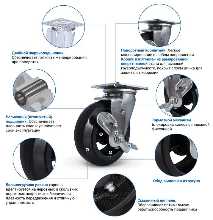 Большегрузное колесо с шинкой из чёрной литой резины диаметром 200 мм. Для крепления предусмотрен поворотный кронштейн с платформой размером 100x115 мм с 4 овальными отверстиями. Расстояние между центрами отверстий 73x85 мм. Общая высота опоры 235 мм. Обод шириной 50 мм не затрудняет ход колеса при повороте. Модель грузоподъемностью 280 кг устанавливается в строительное и складское оборудование большой грузоподъёмности: вышки-туры, строительные леса, подмости, стеллажи и т.д. Удобный боковой тормозной механизм не допускает движения во время стоянки.