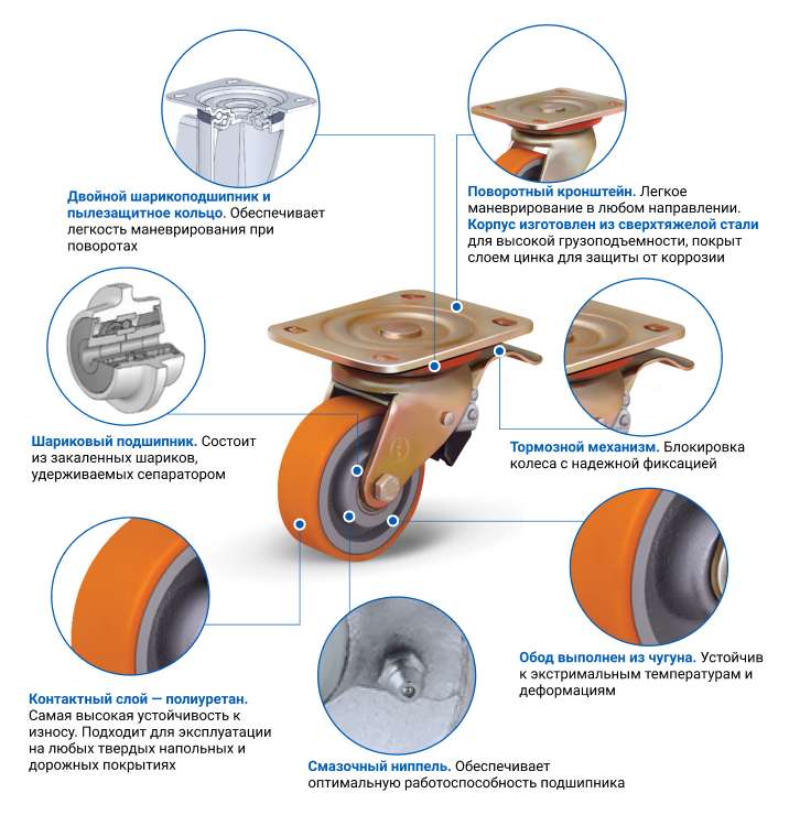 Полиуретановое поворотное колесо с тормозом имеет диаметр 100 мм. Крепится к оборудованию при помощи кронштейна. Платформа размером 115x140 мм с 4 отверстиями, с расстоянием между центрами 81x105 мм. Обод шириной 35 мм устойчив к химической коррозии. Грузоподъемность 350 кг.300+ человек