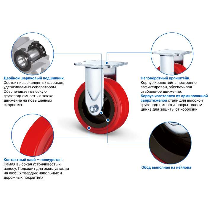 Большегрузная фиксированная колесная опора RONEL с шинкой из полиуретана имеет диаметр 150 мм и обод из полиамида шириной 50 мм. Для крепления используется оцинкованный кронштейн с платформой размером 114x100 мм. Расстояние между центрами отверстий 72x85 мм. Высота колесной опоры 194 мм. Грузоподъемность модели 480 кг. Устанавливается в платформенные грузовые тележки и оборудования для складов, заводов, деревообрабатывающих предприятий и пр.