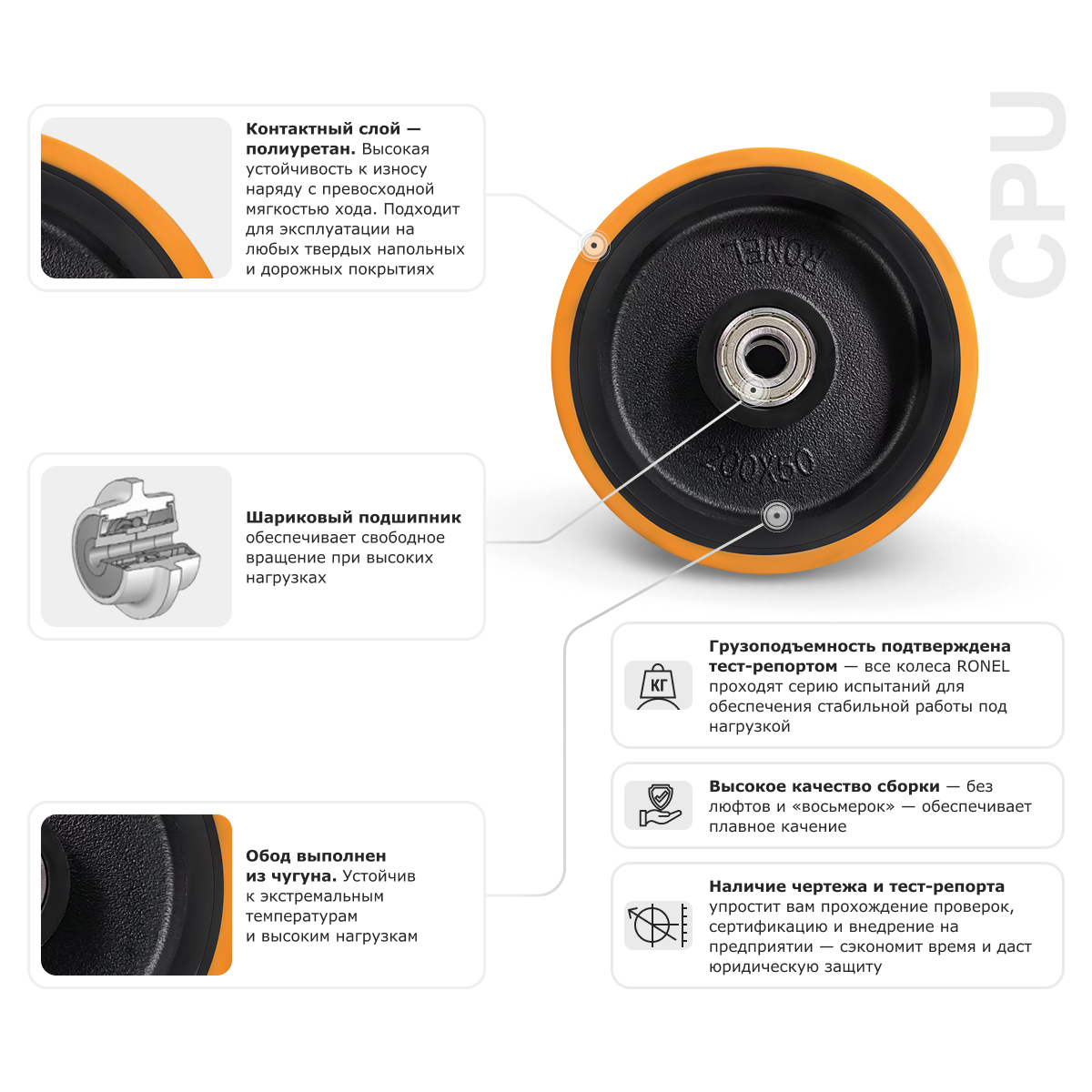 CPU 200 — большегрузное полиуретановое колесо надежного бренда RONEL. Грузоподъемность модели составляет 1080 кг, диаметр — 200 мм. Обод изготовлен из высокопрочного чугуна, в оси установлен шариковый подшипник. Колесо подходит для работы на неровных поверхностях, полах с препятствиями, устойчиво к порезам и сильным ударным нагрузкам. Устанавливается на грузовые платформенные тележки и тяжелое промышленное оборудование. Температурный режим эксплуатации — от -40 до +80 °С.