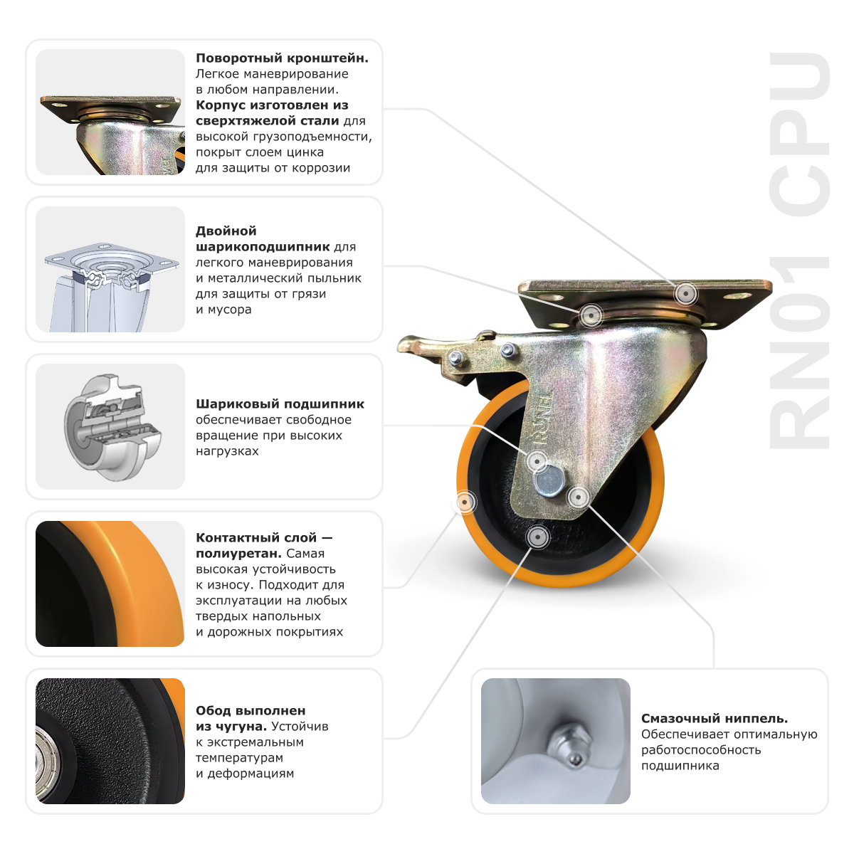 RN01 CPU 200 — большегрузное полиуретановое колесо надежного бренда RONEL. Грузоподъемность модели составляет 1080 кг, диаметр — 200 мм. Обод изготовлен из высокопрочного чугуна, в оси установлен шариковый подшипник. Поворотный стальной кронштейн оцинкован для защиты от коррозии. Колесо подходит для работы на неровных поверхностях, полах с препятствиями, устойчиво к порезам и сильным ударным нагрузкам. Устанавливается на грузовые платформенные тележки и тяжелое промышленное оборудование. Температурный режим эксплуатации — от -40 до +80 °С.