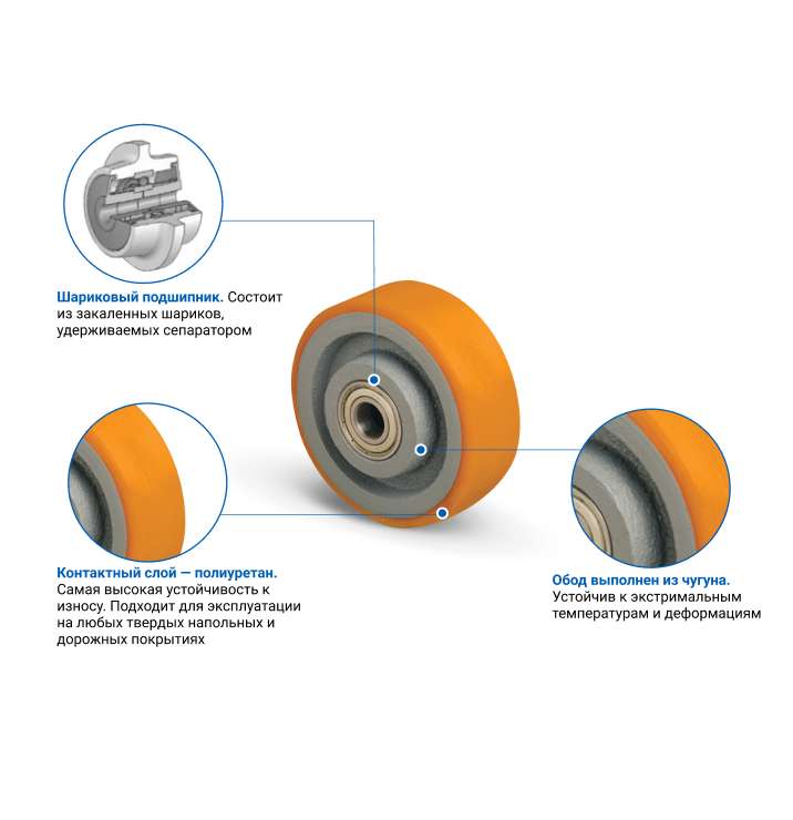Большегрузное колесо с чугунным ободом и шинкой из полиуретана с креплением на ось диаметром 200 мм. Обладает высокой несущей способностью, устойчиво к осевым и радиальным нагрузкам. Ширина обода 50 мм. В ступице надёжный шариковый подшипник. Диаметр внутренней оси 20 мм. Максимальная грузоподъемность 900 кг. Используется для установки в платформенные тележки, большегрузное оборудование.300+ человек