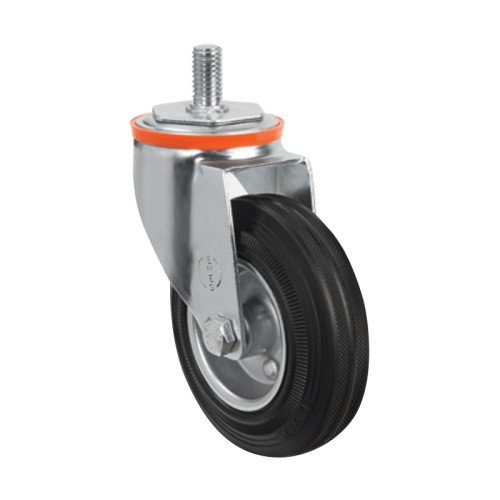 Серия промышленных колес EM05 SPR — это универсальные модели, подходящие для установки на различное оборудование (строительное, коммунальное, промышленное). Колесо состоит из шинки, материалом которой является черная прочная резина, и обода из стали с оцинковкой. Кронштейн также изготовлен из оцинкованной стали и имеет поворотную конструкцию. В узле устанавливается двойной шарикоподшипник, который защищен пыльником из пластика. Крепление болтовое.