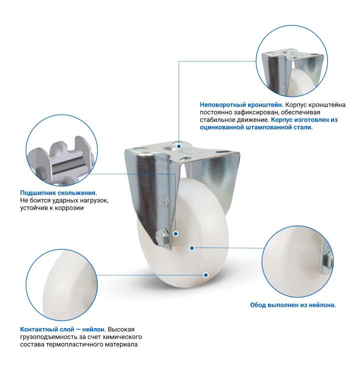 Монолитное колесо из полиамида диаметром 65 мм с неповоротным кронштейном. При помощи площадки размером 85x100 мм крепится к оборудованию четырьмя болтами. Расстояние между центрами отверстий 60x80 мм. Ширина обода 30 мм, грузоподъемность 120 кг. Благодаря высокой стойкости к химической коррозии и воздействию воды, устанавливается в торговые, медицинские и платформенные тележки, стеллажи и оборудование для пищевой промышленности.300+ человек