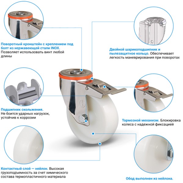 Монолитное колесо из нейлона с поворотным кронштейном имеет крепление под болт и ножной тормоз. Диаметр колеса 125 мм. Для фиксации предусмотрено отверстие диаметром 12 ммм с резьбой. Обод шириной 37.5 мм хорошо распределяет нагрузку. Грузоподъемность 160 кг. Устанавливается в медицинское, торговое и сервисное оборудование.