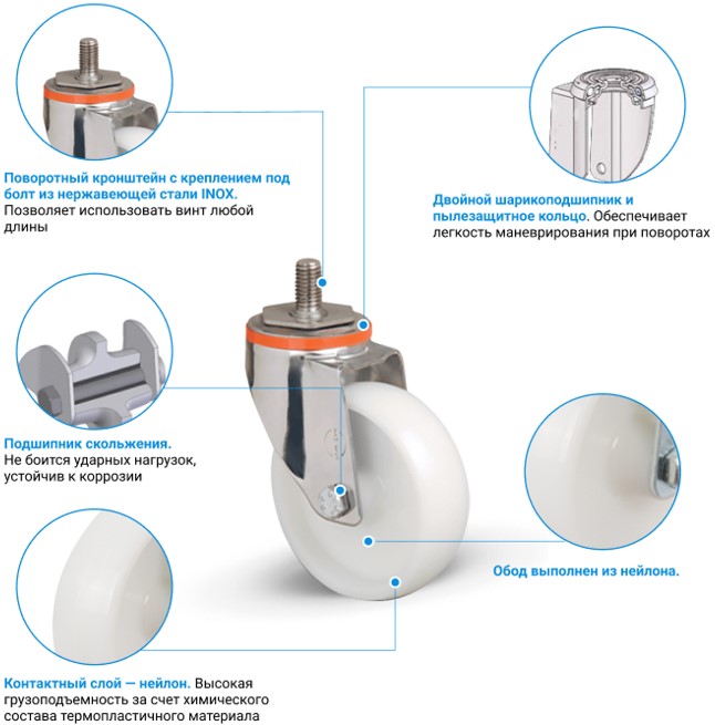 Монолитное нейлоновое колесо диаметром 80 мм с поворотным кронштейном из нержавеющей стали. Грузоподъемность 120 кг. Для фиксации к оборудованию предусмотрено болтовое крепление. Диаметр болта M16 - 5/8 мм. Высота колесной опоры 106 мм. Обод шириной 30 мм равномерно распределяет нагрузку, устойчив к агрессивным химическим веществам. Рекомендовано для установки в торговое и сервисное оборудование, тележки для медицинской и пищевой промышленности.