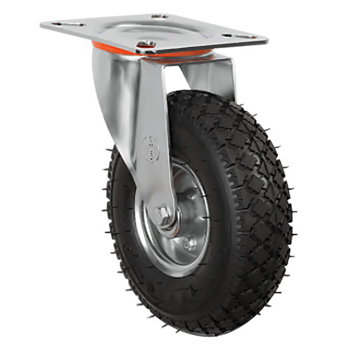 Поворотное пневматическое колесо с ободом и кронштейном из прессованной стали. Контактный слой (шинка) из литой износостойкой резины. В ступице установлен шариковый подшипник. Кронштейн с поворотным механизмом изготовлен из оцинкованной стали. В поворотном узле двойной шарикоподшипник, закрытый пластиковым пыльником. Тип крепления – платформа с 4 техническими отверстиями.