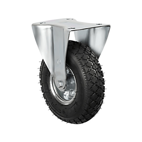 Неповоротное пневматическое колесо с ободом и кронштейном из прессованной стали. Шинка отлита из чёрной износостойкой резины. В ступице установлен шариковый подшипник. Кронштейн с площадкой для крепления изготовлен из оцинкованной стали. Для крепления предусмотрена площадка с 4 техническими отверстиями.