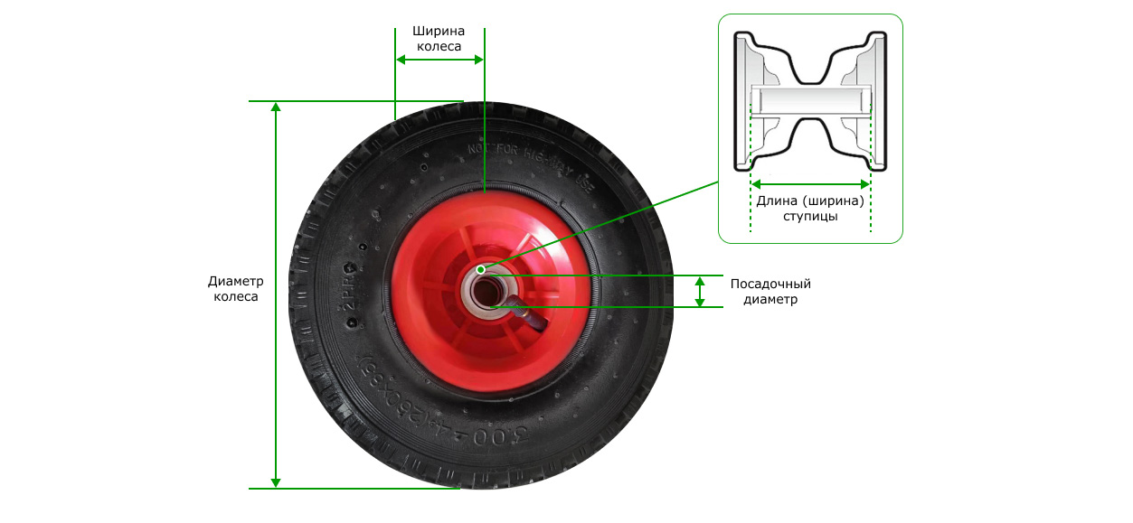 Пневматическое колесо диаметром 260 мм с несимметричной ступицей и шариковым подшипником. Имеет пластиковый неразборный обод и шину размером 3.00-4. Легкое, малошумное. Тип крепления — на ось с помощью шпильки. Ширина колеса — 78 мм, диаметр ступицы (посадочный диаметр) — 20 мм, ширина ступицы — 55 мм. Максимальная грузоподъемность — 140 кг.