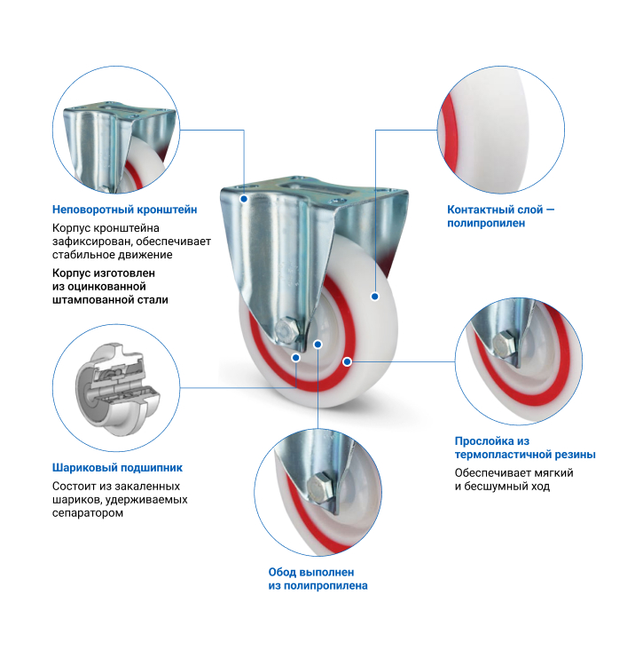 Колесо полипропиленовое с прослойкой из термопластичной резины. Неповоротный кронштейн выполнен из оцинкованной стали. В оси колеса установлен шариковый подшипник. Основные преимущества EM02MBTM125 — бесшумный и мягкий ход, исключительная устойчивость к ударам и истиранию. Грузоподъемность составляет 160 кг, диаметр — 125 мм. Модель подходит для установки на покупательские тележки и прочее торговое оборудование.