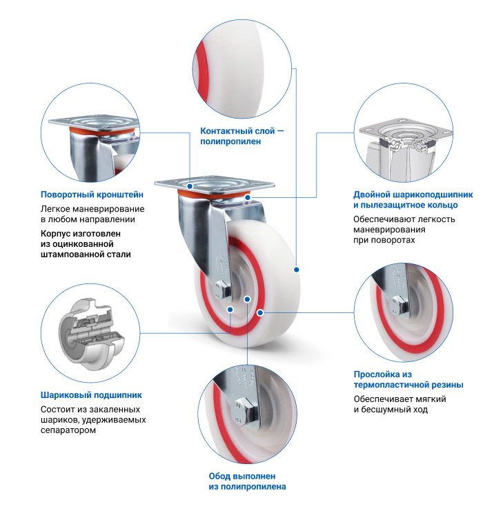 Колесо полипропиленовое с прослойкой из термопластичной резины. Кронштейн выполнен из оцинкованной стали, тип крепления — платформа. В поворотном узле и оси колеса установлен шариковый подшипник. Основные преимущества EM01MBTM100 — бесшумный и мягкий ход, исключительная устойчивость к ударам и истиранию. Грузоподъемность составляет 140 кг, диаметр — 100 мм. Модель подходит для установки на покупательские тележки и прочее торговое оборудование.