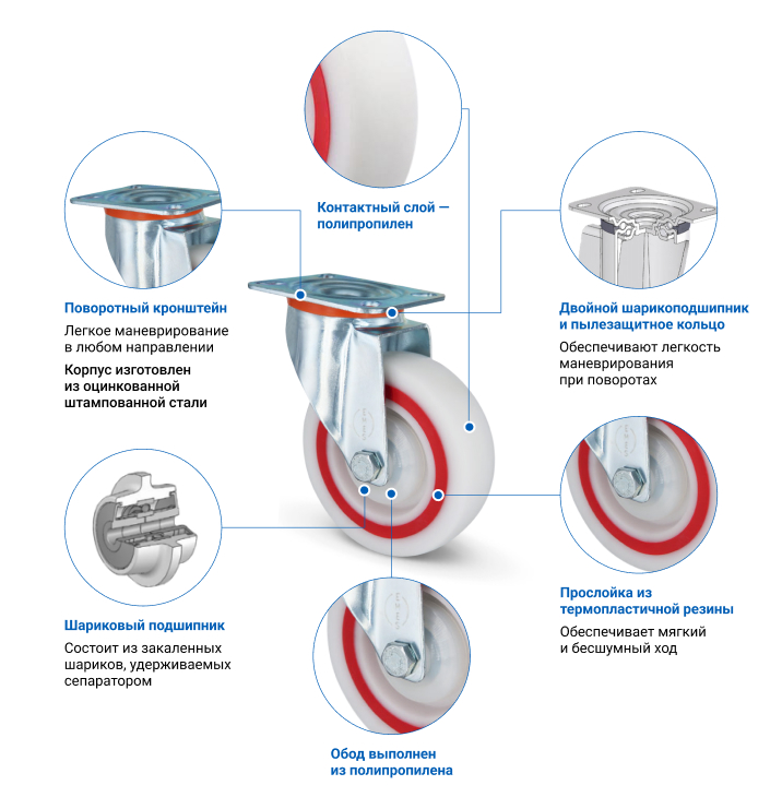 Колесо полипропиленовое с прослойкой из термопластичной резины. Кронштейн выполнен из оцинкованной стали, тип крепления — платформа. В поворотном узле и оси колеса установлен шариковый подшипник. Основные преимущества EM01MBTM125 — бесшумный и мягкий ход, исключительная устойчивость к ударам и истиранию. Грузоподъемность составляет 160 кг, диаметр — 125 мм. Модель подходит для установки на покупательские тележки и прочее торговое оборудование.