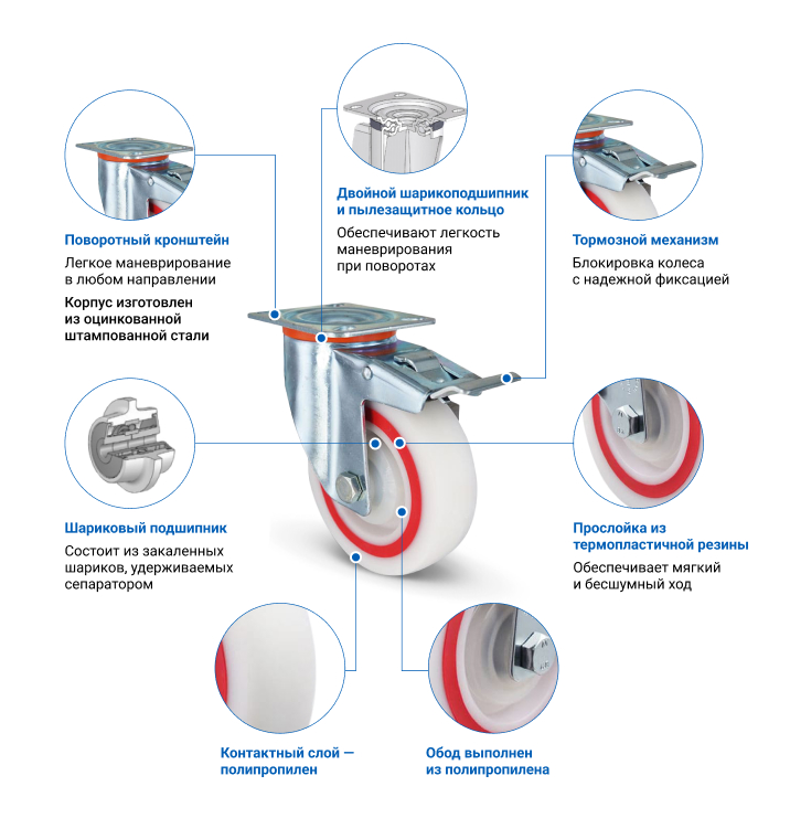 Колесо полипропиленовое с прослойкой из термопластичной резины. Кронштейн выполнен из оцинкованной стали, тип крепления — платформа, есть тормозной механизм. В поворотном узле и оси колеса установлен шариковый подшипник. Основные преимущества EM01MBTM100F — бесшумный и мягкий ход, исключительная устойчивость к ударам и истиранию. Грузоподъемность составляет 140 кг, диаметр — 100 мм. Модель подходит для установки на покупательские тележки и прочее торговое оборудование.