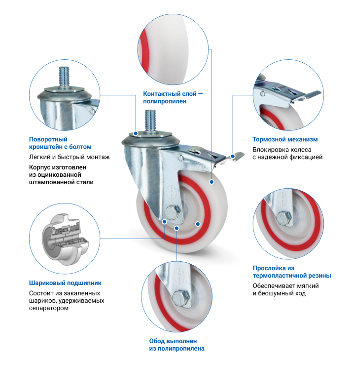 Колесо полипропиленовое с прослойкой из термопластичной резины. Кронштейн выполнен из оцинкованной стали, тип крепления — с болтом, есть тормозной механизм. В поворотном узле и оси колеса установлен шариковый подшипник. Основные преимущества EM05MBTM100F — бесшумный и мягкий ход, исключительная устойчивость к ударам и истиранию. Грузоподъемность составляет 140 кг, диаметр — 100 мм. Модель подходит для установки на покупательские тележки и прочее торговое оборудование.