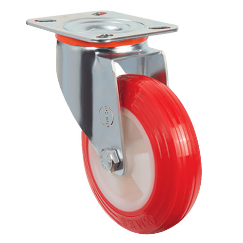 Литой прочный обод из нейлона RONEL. В оси установлен роликовый подшипник. Шинка из прочного эластичного полиуретана. Поворотный кронштейн из оцинкованной стали с платформой для крепления и удобным ножным тормозом.