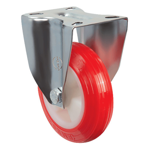 Обод колеса из полиамида, шинка из термопластичного полиуретана (95 Шор А). Отличается высокой прочностью и устойчивостью к большинству агрессивных химических соединений. В оси подшипник скольжения. Неповоротный кронштейн из оцинкованной стали с платформенным типом крепления.