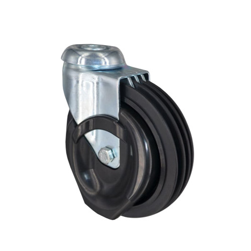 Обод колеса из полиамида, шинка из термопластичного полиуретана (95 Шор А). Отличается высокой прочностью и устойчивостью к большинству агрессивных химических соединений. В оси подшипник скольжения. Поворотный кронштейн из оцинкованной стали. Тип крепления– под болт. В поворотном узле двойной шарикоподшипник.