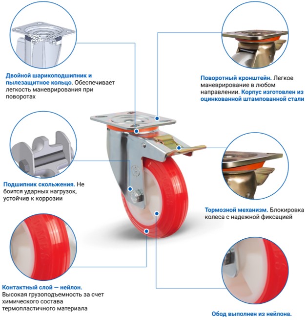 Полиуретановая поворотная колесная опора с тормозом диаметром 200 мм. Обод отлит из прочного нейлона, в ступице подшипник скольжения. Поворотный узел с двойным шарикоподшипником защищён пыльником. Для крепления на кронштейне имеется платформа размером 115x141 мм с техническими отверстиями, расстояние между центрами которых 80x105 мм. Обод шириной 50 мм устойчив к химической коррозии и влаге. Грузоподъемность 230 кг позволяет установку в покупательские и платформенные тележки, промышленное оборудование, стеллажи, контейнеры и т.п. Тормоз не допускает самопроизвольного движения во время стоянки.300+ человек