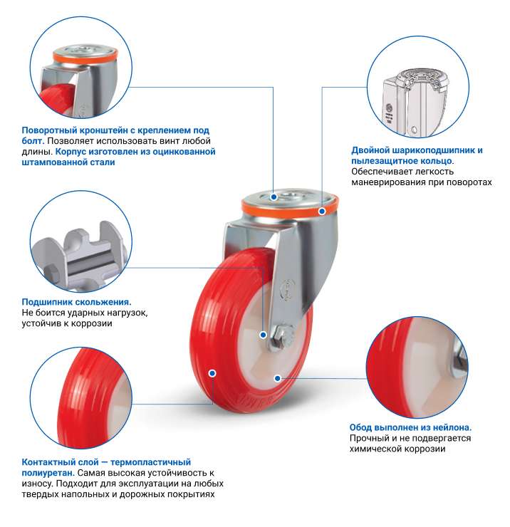 Полиуретановое колесо с креплением под болт с поворотным кронштейном диаметром 80 мм. Грузоподъемность 90 кг. Для крепления предусмотрено специальное отверстие для болта диаметром 12 мммм. Повортный узел с шарикоподшипником и пластиковым пыльником. Обод из полиамида, устойчивого к химической коррозии, шириной 30 мм. Устанавливается в промышленное оборудование, платформенные и покупательские тележки, стеллажи, евроконтейнеры и т.д.300+ человек