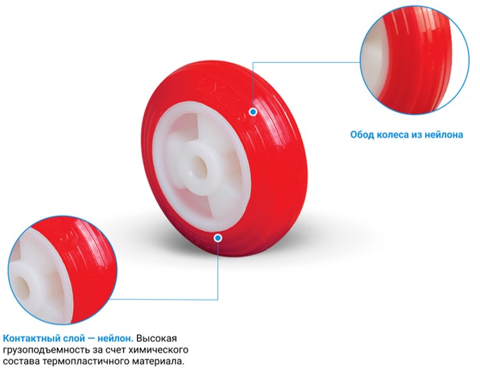 Колесо без кронштейна с контактным слоем из полиуретана имеет высокую прочность и химическую стойкость. Диаметр 80 мм. Тип крепления – на ось. Обод из нейлона шириной 30 мм, диаметр внутренней оси 12 мм. Модель имеет грузоподъемность 90 кг. Устойчиво к истиранию и значительным температурным перепадам. Устанавливается в покупательские тележки, торговое оборудование, аппаратуру.