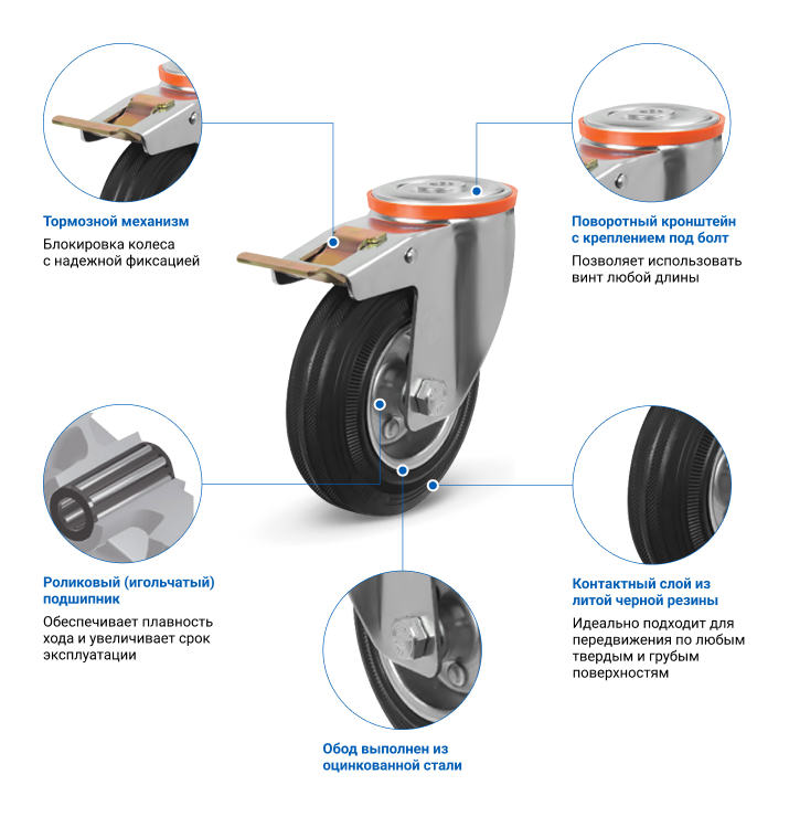 Контактная поверхность колеса EM04SPR80F изготавливается из прочной черной резины. Материалом металлических составляющих опоры (кронштейн, обод) является оцинкованная сталь. Ширина обода равна 25 мм. Высота опоры составляет 106 мм. В ступице размещен роликовый подшипник. В поворотном кронштейне предусмотрено наличие тормоза, крепежный элемент рассчитан на способ крепления «под болт». Грузоподъемность 60 кг.
