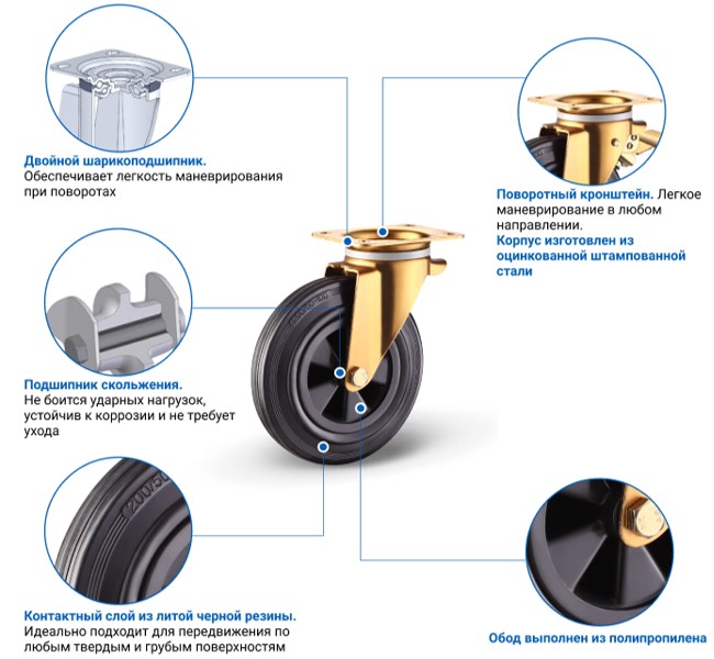 Колесо усиленное RONEL серии SCM с ободом из прочного пластика и шинкой из чёрной резины. Кронштейн из оцинкованной стали. Диаметр колеса 160 мм. В ступице подшипник скольжения с пластиковой втулкой, который выдерживает большую нагрузку. Обод шириной 47 мм обеспечивает движение по полу из материала любого типа. Максимальная грузоподъёмность 200 кг. Площадка для крепления размером 135x110 мм. Общая высота колёсной опоры 180 мм. Устанавливается в платформенные тележки, контейнеры для ТБО, евроконтейнеры, складское оборудование, вышки-туры, строительные леса.