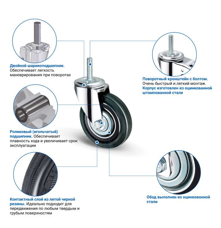 Поворотное промышленное колесо диаметром 160 мм с кронштейном из оцинкованной стали. Обод отлит из оцинкованной стали, шинка – из литой чёрной резины. Высота колесной опоры 187 мм. Ширина обода 36 мм. Модель грузоподъемностью 190 кг предназначена для установки в строительные леса, вышки-туры, передвижное складское и промышленное оборудование.