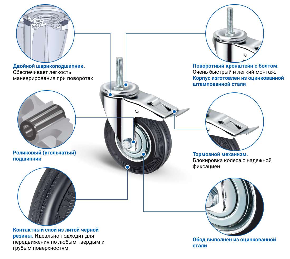 Поворотное промышленное колесо диаметром 125 мм с кронштейном из оцинкованной стали и тормозом. Обод отлит из оцинкованной стали, шинка – из литой чёрной резины. Высота колесной опоры 148 мм. Ширина обода 34 мм. Модель грузоподъемностью 125 кг предназначена для установки в строительные леса, вышки-туры, передвижное складское и промышленное оборудование.