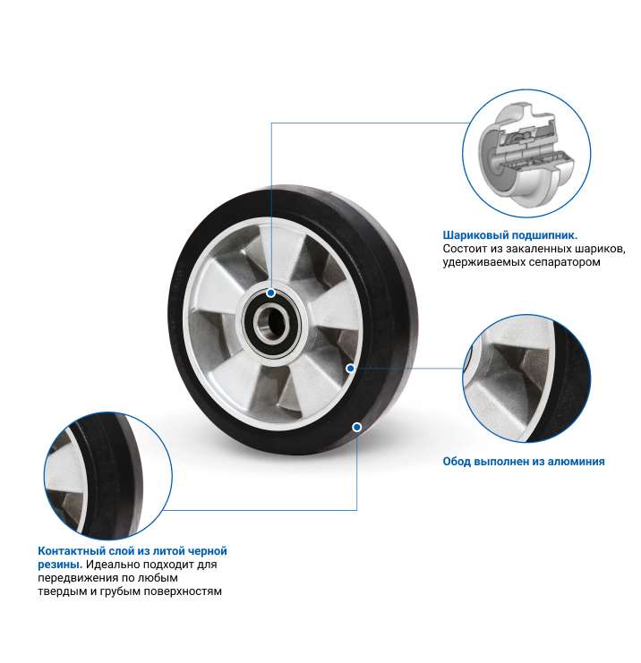 Рулевое колесо с литым ободом из прочного сплава из алюминия с рёбрами жёсткости и литой шинкой из чёрной резины. Диаметр 180 мм. Контактный слой хорошо поглощает вибрацию при движении по неровной поверхности, устойчив к абразивному износу, раздиру, порезам. В ступице шариковый подшипник, который обеспечивает лёгкий и плавный ход рохли под значительной нагрузкой. Диаметр внутренней оси 20 мм. Ширина обода 50 мм, что обеспечивает хорошую устойчивость. Грузоподъёмность 550 кг. На светлых полах может оставлять тормозной след. Устанавливается в гидравлические тележки разной грузоподъёмности, которые будут использоваться на грубых и неровных поверхностях.