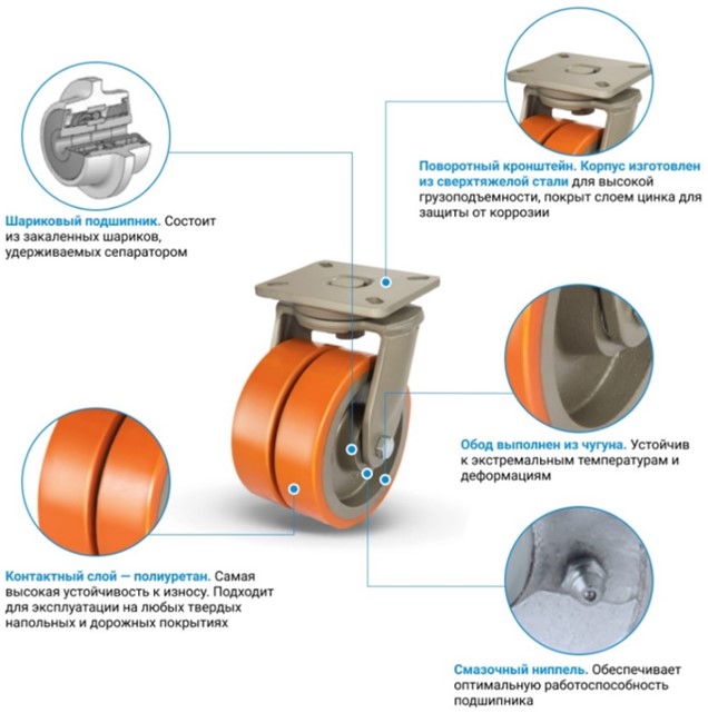 Сдвоенное поворотное большегрузное колесо с шинкой из полиуретана имеет диаметр 200 мм. Грузоподъемность 1800 кг. Для крепления используется усиленный кронштейн из толстолистовой стали с поворотной платформой размером 140x175 мм. Расстояние между центрами отверстий 105x140 ммm. В оси и поворотном узле надёжные шариковые подшипники. Чугунный обод колёс шириной 50 мм хорошо распределяет нагрузку. Высота опоры 266 мм. Устанавливается в платформенные тележки и оборудование для супернагрузок.300+ человек