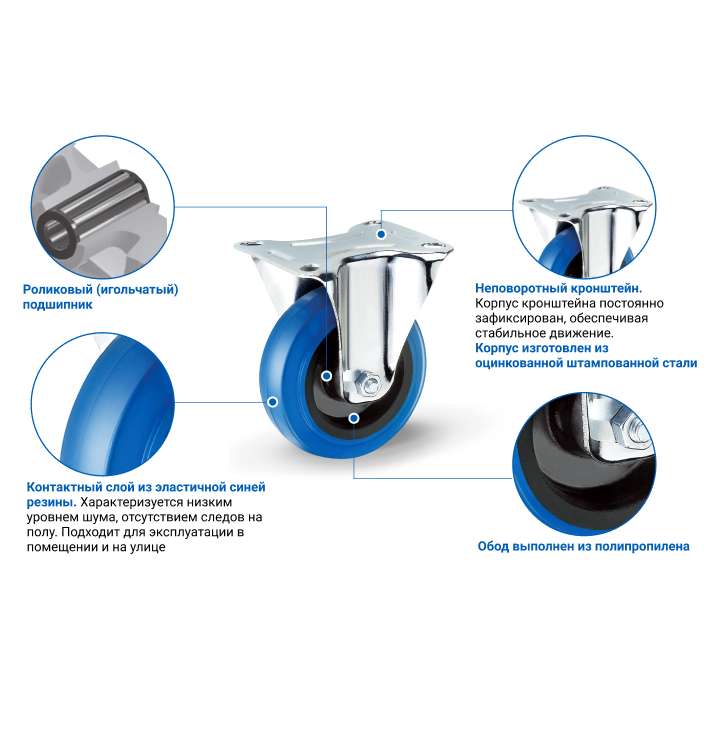 Колесная опора с контактным слоем из синей эластичной резины RONEL. Роликовый пластиковый подшипник в ступице. Диаметр колеса 100 мм, высота колёсной опоры 128 мм, грузоподъёмность 130 кг. Платформа 104x80 мм. Колёса для торгового и музыкального оборудования, платформенных тележек, аппаратуры, больничной мебели, покупательских тележек и пр.