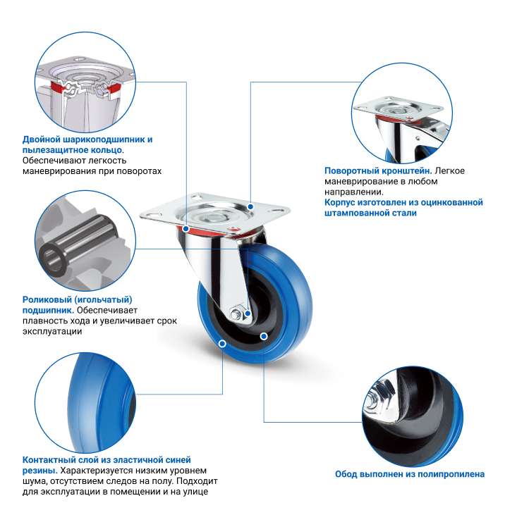 Колесная опора с контактным слоем из синей эластичной резины RONEL. Роликовый пластиковый подшипник в ступице. Диаметр колеса 100 мм, высота колёсной опоры 128 мм, грузоподъёмность 130 кг. Платформа 104x80 мм. Колёса для торгового и музыкального оборудования, платформенных тележек, аппаратуры, больничной мебели, покупательских тележек и пр.