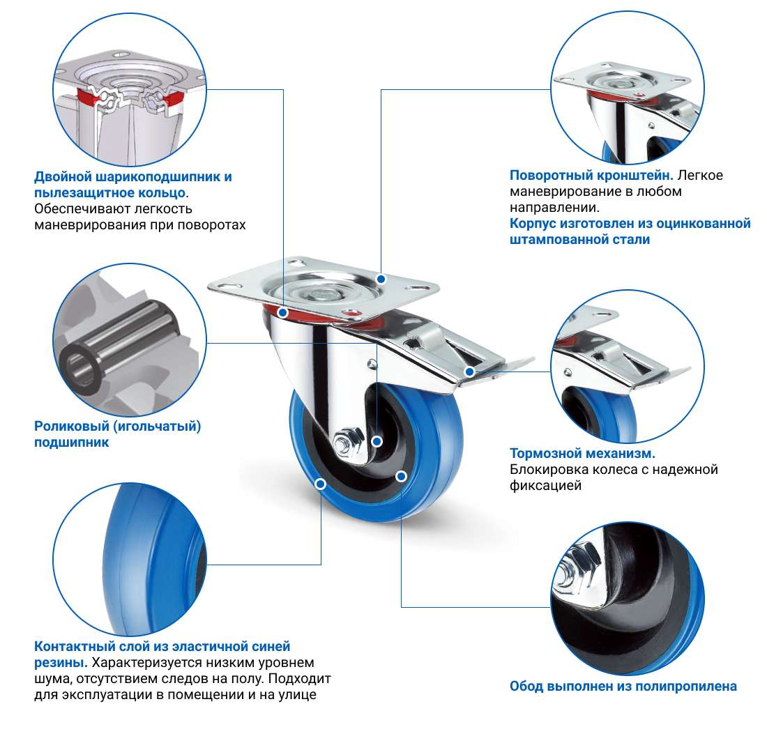Колесная опора с контактным слоем из синей эластичной резины RONEL. Роликовый пластиковый подшипник в ступице. Диаметр колеса 100 мм, высота с кронштейном 128 мм, грузоподъёмность 130 кг. Платформа 104x80 мм. Колёса для торгового и музыкального оборудования, платформенных тележек, аппаратуры, больничной мебели, покупательских тележек и пр.