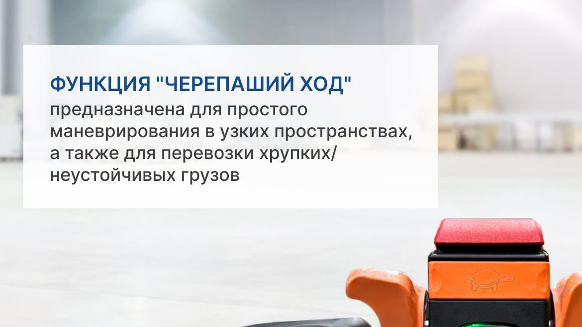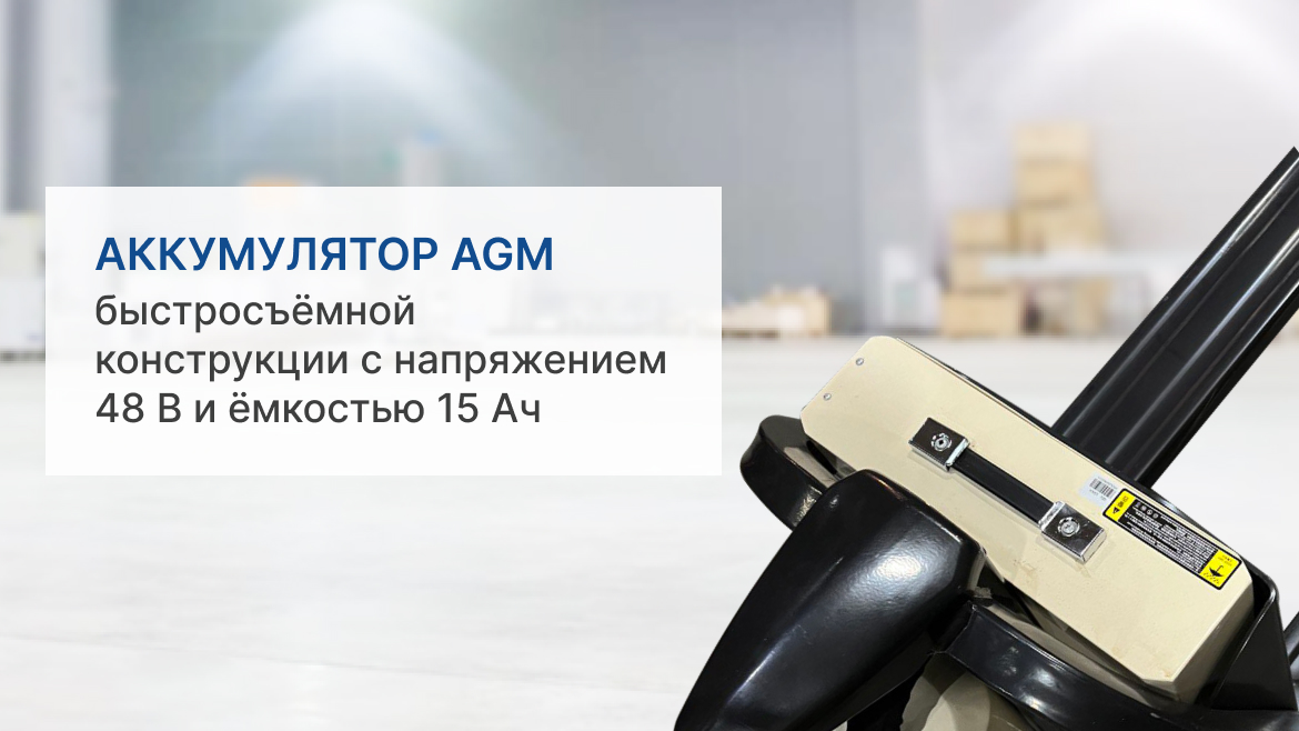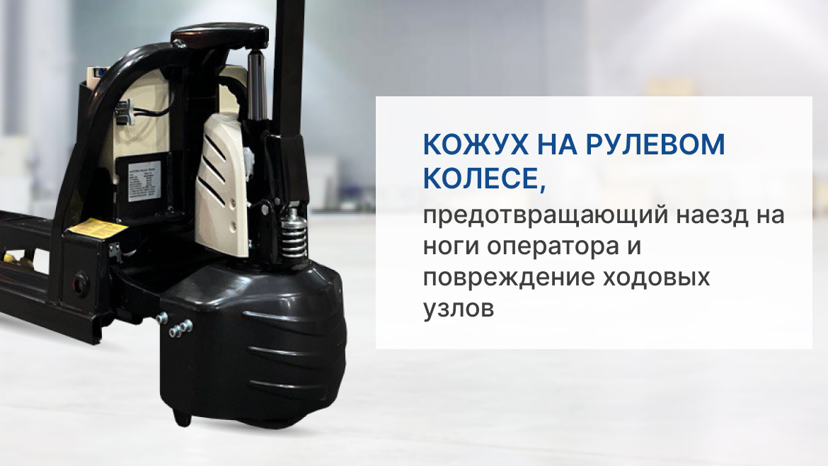 Необслуживаемый AGM аккумулятор быстросъемной конструкции обеспечивает долгую автономную работу и удобство замены при необходимости. Защитные кожухи предотвращают повреждения ведущего колеса и ходового двигателя, исключают вероятность наезда на ноги оператора. Дополнительные упоры обеспечивают отличную устойчивость, исключая опрокидывание при нарушении правил эксплуатации. Модель оснащена функцией «черепашьего хода» для удобного маневрирования в узких пространствах и обработки хрупких грузов, а также системой предотвращения откатов на уклоне, функцией реверсивного торможения.